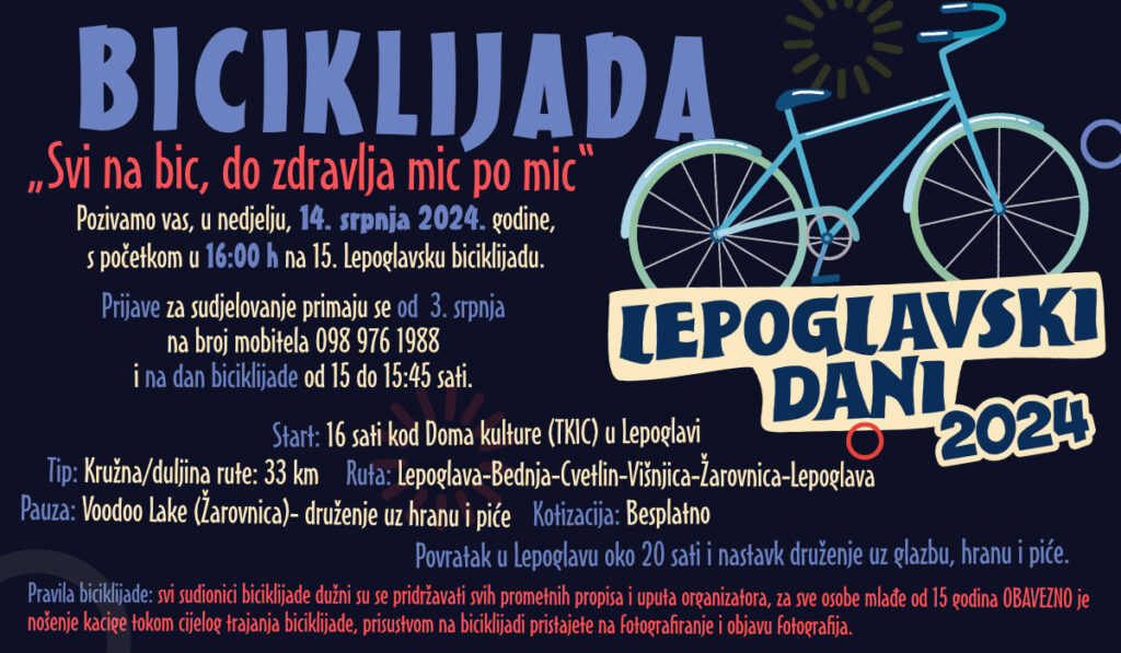 Pozivamo vas, u nedjelju, 14. srpnja 2024. godine, s početkom u 16:00 h na 15. po redu Lepoglavsku biciklijadu.